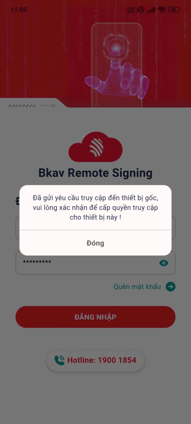 Bạn mở ứng dụng Bkav Remote Signing trên thiết bị truy cập và đăng nhập. Ứng dụng hiển thị thông báo “Đã gửi yêu cầu truy cập đến thiết bị gốc, vui lòng xác nhận để cấp quyền truy cập cho thiết bị này”. (Hình 1)