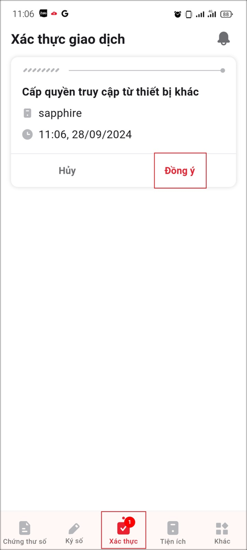 Bước 3: Trên thiết bị gốc, Bạn mở tab Xác thực sau đó bấm Đồng ý để cấp quyền truy cập cho thiết bị khác.