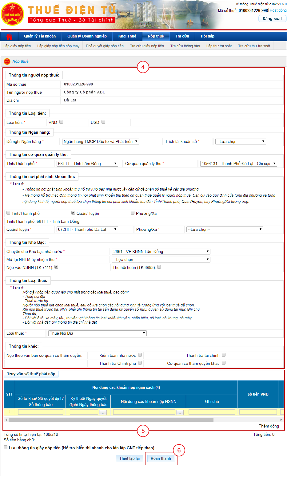 Bước 4: Hệ thống hiển thị giao diện hỗ trợ Lập giấy nộp tiền, nhập đầy đủ Thông tin giấy nộp tiền (4), Nội dung các khoản nộp ngân sách (5) sau đó bấm Hoàn thành (6).