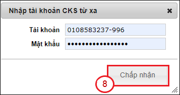 Bước 6: Hiển thị cửa sổ Nhập tài khoản CKS từ xa. Bạn nhập thông tin tài khoản rồi bấm Chấp nhận (7). Yêu cầu xác thực ký số sẽ được gửi về ứng dụng Bkav Remote Signing trên thiết bị di động.