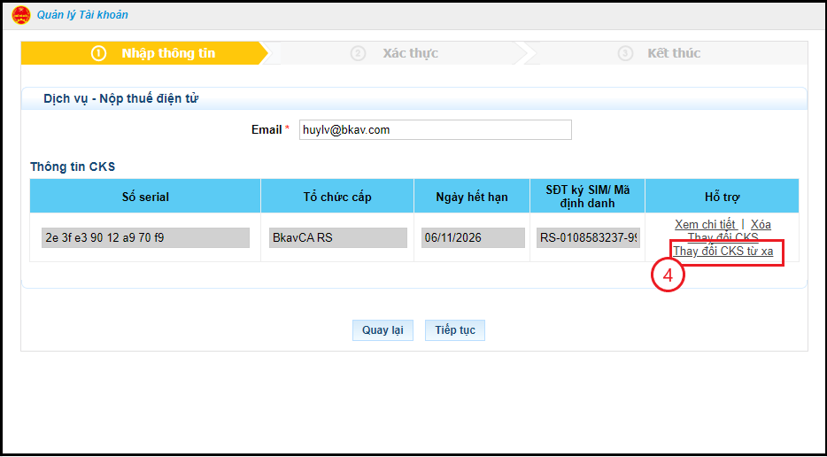 Bước 4: Hệ thống hiển thị giao diện Nhập thông tin, bấm Thay đổi CKS từ xa(4) để cập nhật thông tin CTS mới.