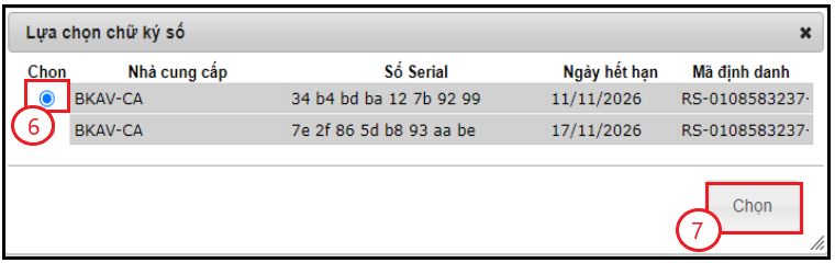 Bước 6: Hệ thống hiển thị cửa sổ Lựa chọn chữ ký số, Bạn tick chọn thông tin chữ ký số đang sử dụng (6) sau đó bấm Chọn (7).