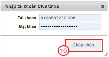 Bước 9: Hiển thị cửa sổ Nhập tài khoản CKS từ xa. Bạn nhập thông tin tài khoản rồi bấm Chấp nhận (10).