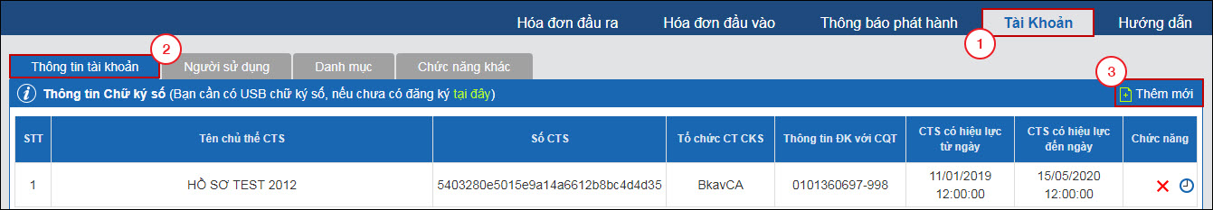 Bước 3: Sau khi Đăng nhập thành công, bấm vào Tài khoản (1). Tại mục Thông tin tài khoản (2), trên băng Thông tin Chữ ký số bấm Thêm mới (3).