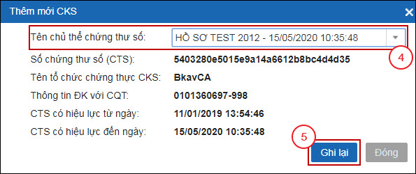 Bước 4: Hệ thống hiển thị Giao diện Thêm mới CKS, chọn Tên chủ thể chứng thư số có thời hạn xa nhất (4) sau đó bấm Ghi lại (5).