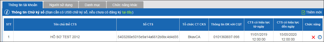 Bước 5: Sau khi Ghi lại thành công, trên băng Thông tin tài khoản xuất hiện thông tin Tên chủ thể CTS có Số chứng thư số mới vừa thêm.