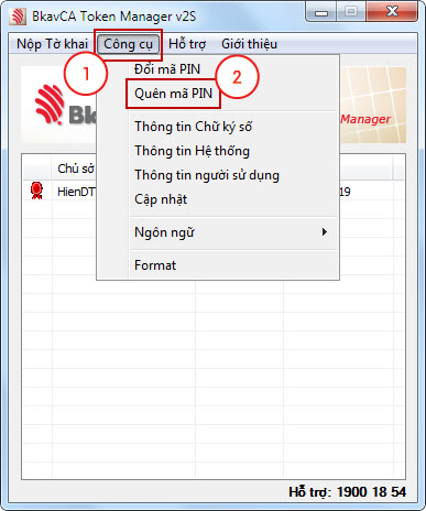 Bước 3: Trên giao diện BTM, bấm vào menu Công cụ (1) sau đó chọn Quên mã PIN (2)