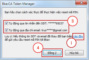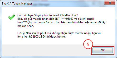 Bước A2: Bấm Đồng ý xuất hiện thông báo “Cảm ơn bạn đã gửi yêu cầu Reset PIN đến Bkav !…”, bạn bấm OK (5) để đóng thông báo này