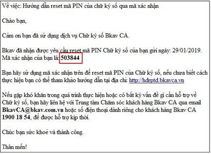 Bước B4: Sau khi nhận được yêu cầu, Bkav sẽ liên hệ lại xác nhận và thực hiện reset MÃ PIN.