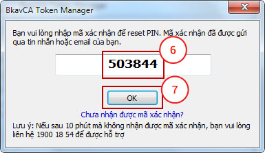 Bước A3: Cửa sổ BkavCA Token Manager hiện ra yêu cầu nhập Mã xác nhận để reset PIN