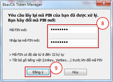 Bước A6: Bấm OK, cửa sổ BkavCA Token Manager hiện ra yêu cầu nhập Mã PIN mới (8), sau khi nhập xong bạn bấm Đồng ý (9)