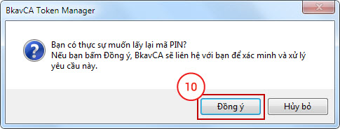 Bước B1: Sau khi bấm Quên mã PIN trên BTM, cửa số BkavCA Token Manager xuất hiện, bạn chọn Đồng ý (10)