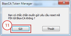 Bước B2: Cửa sổ BkavCA Token Manager hiện ra có thông báo “Bạn có chắc chắn muốn gửi yêu cầu reset mã PIN tới BkavCA không?”, bạn bấm Gửi (11)