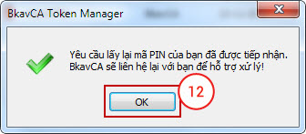 Bước B3: Bấm OK để hoàn tất việc gửi yêu cầu reset MÃ PIN đến Bkav CA.