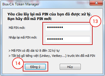 Trong cả 2 cách, hệ thống sẽ hiển thị giao diện nhập MÃ PIN mới. Mã PIN do bạn tự đặt, có độ dài từ 8 đến 32 ký tự. Bạn nhập Mã PIN mới (13) rồi bấm nút Đồng ý (14).