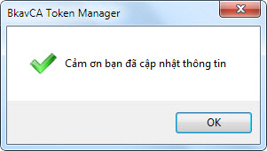 Bước 6: Bấm Cập nhật, cửa sổ BkavCA Token Manager hiển thị thông báo “Cảm ơn bạn đã cập nhật thông tin”