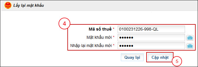 Bước 5: Điền Mã số thuế, Mật khẩu mới, Nhập lại mật khẩu mới (4) sau đó bấm Cập nhật (5).