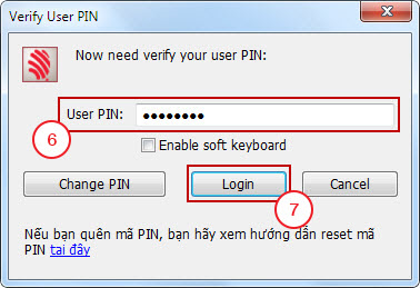 Bước 6: Điền User PIN (6) là MÃ PIN của USB Token CKS sau đó bấm Login (7).