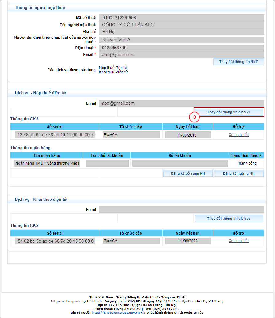 Bước 4: Tại mục Dịch vụ - Nộp thuế điện tử, bấm Thay đổi thông tin dịch vụ (3).