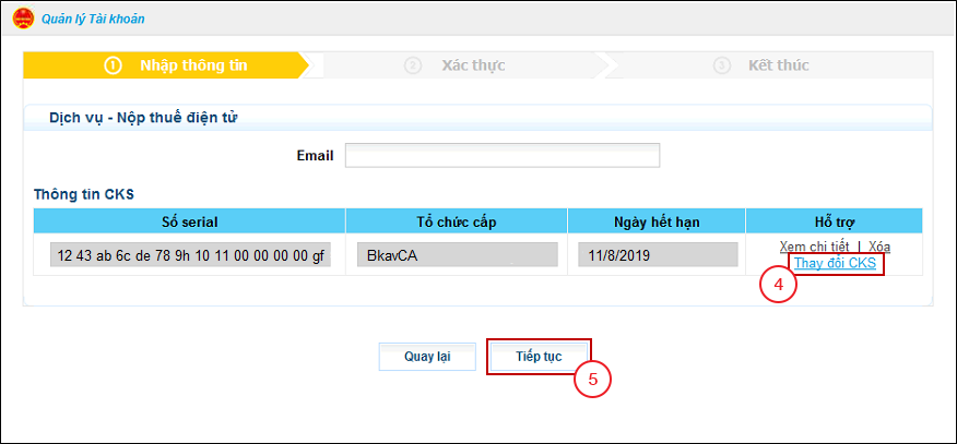 Bước 5: Hệ thống hiển thị bước Nhập thông tin, bấm Thay đổi CKS (4) để cập nhật thông tin CTS mới, sau đó bấm Tiếp tục (5).