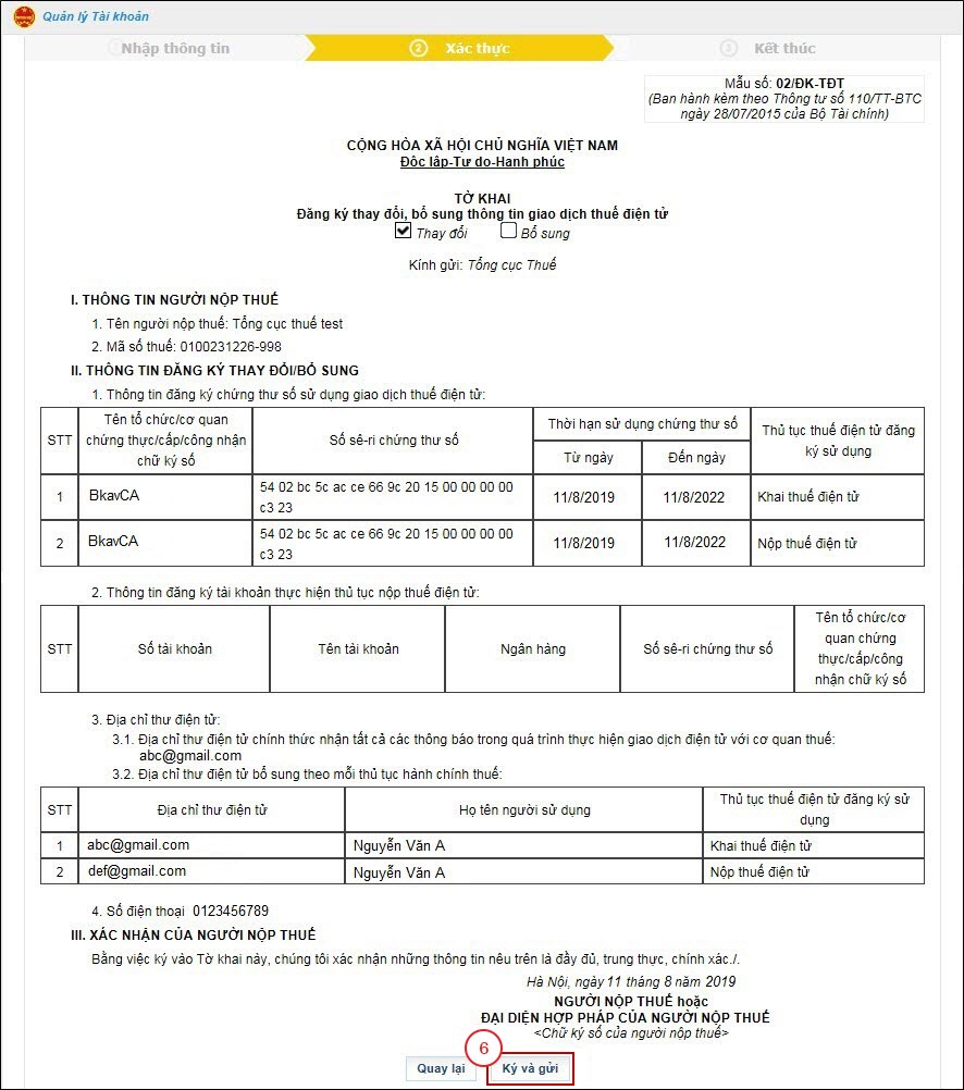 Bước 6: Hệ thống hiển thị bước Xác thực, Bạn kiểm tra các thông tin trên tờ khai “Đăng ký thay đổi, bổ sung thông tin giao dịch thuế điện tử”, nếu tất cả đều đã chính xác, Bạn bấm Ký và gửi (6).